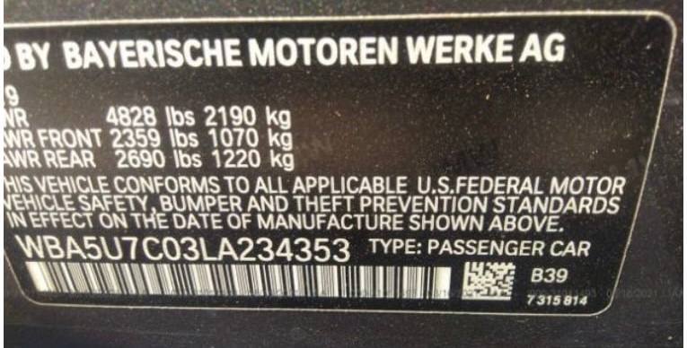 VIN:WBA5U7C03LA234353