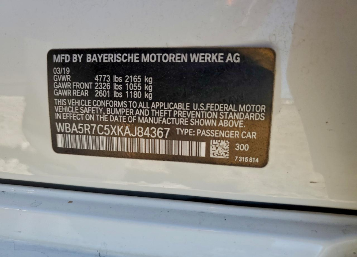 VIN:WBA5R7C5XKAJ84367