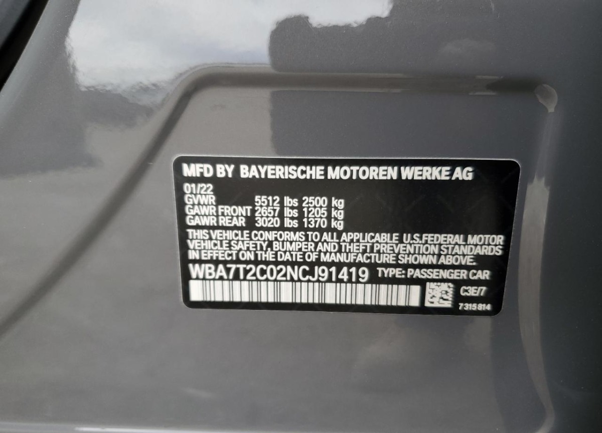 VIN:WBA7T2C02NCJ91419