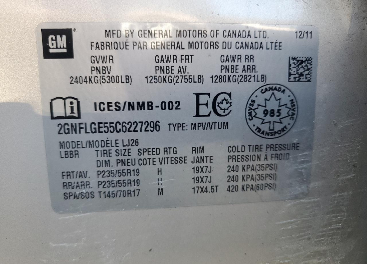 VIN:2GNFLGE55C6227296