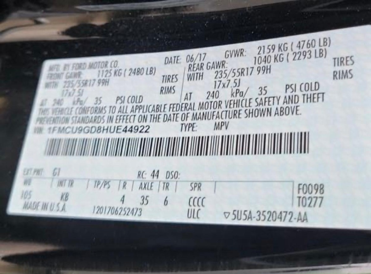 • VIN: 1FMCU9GD8HUE44922