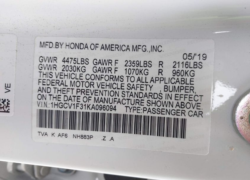 VIN:1HGCV1F31KA096094