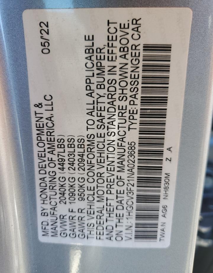• VIN: 1HGCV3F21NA023685