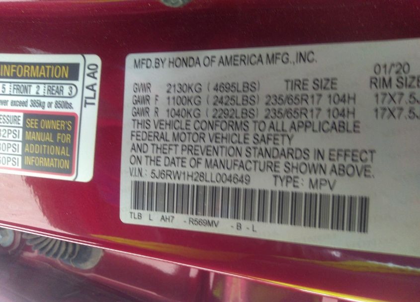 VIN:5J6RW1H28LL004649