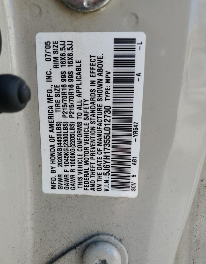 • VIN: 5J6YH17355L012730