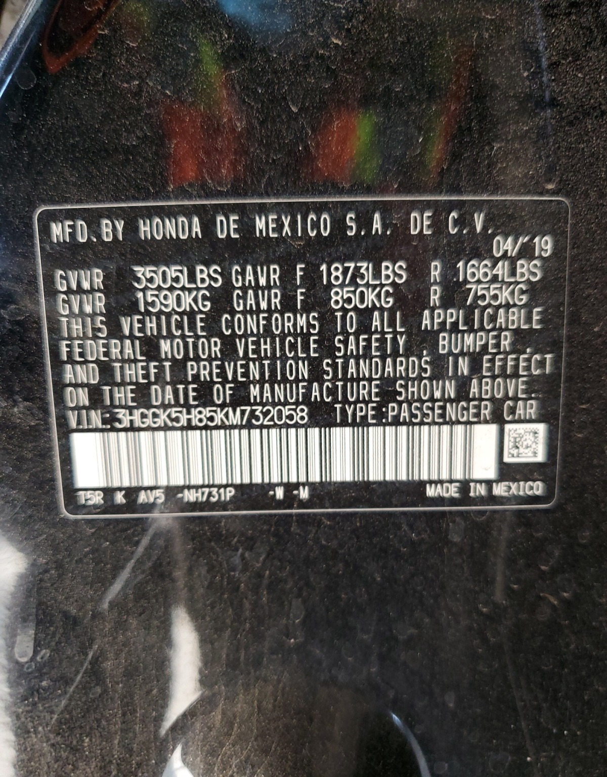 VIN:3HGGK5H85KM732058