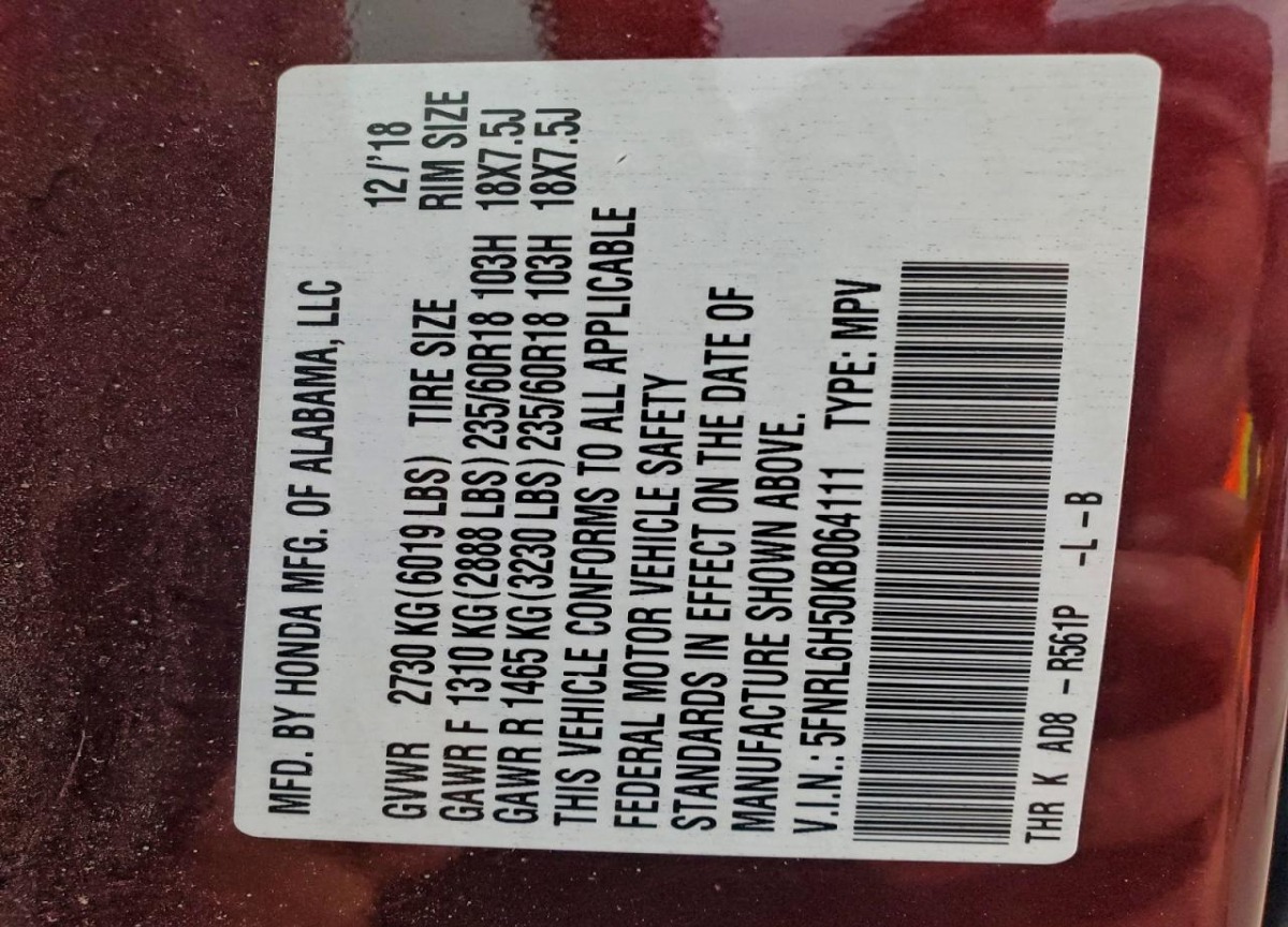 VIN:5FNRL6H50KB064111
