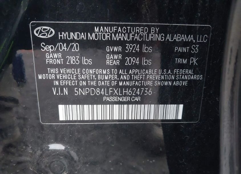 5NPD84LFXLH624736 Hyundai Elantra 2020 Black – history, photos, price