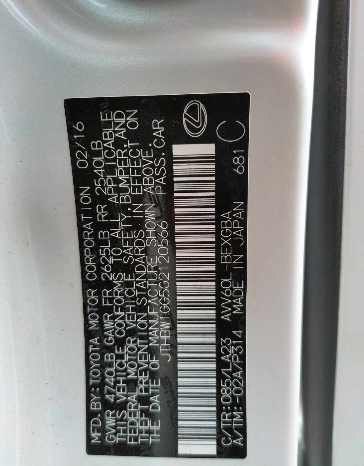 VIN:JTHBW1GG5G2120566