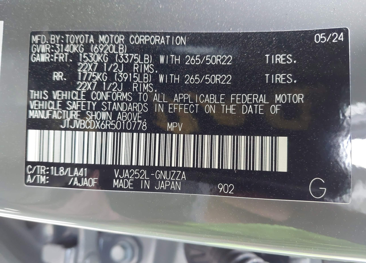 • VIN: JTJVBCDX6R5010778