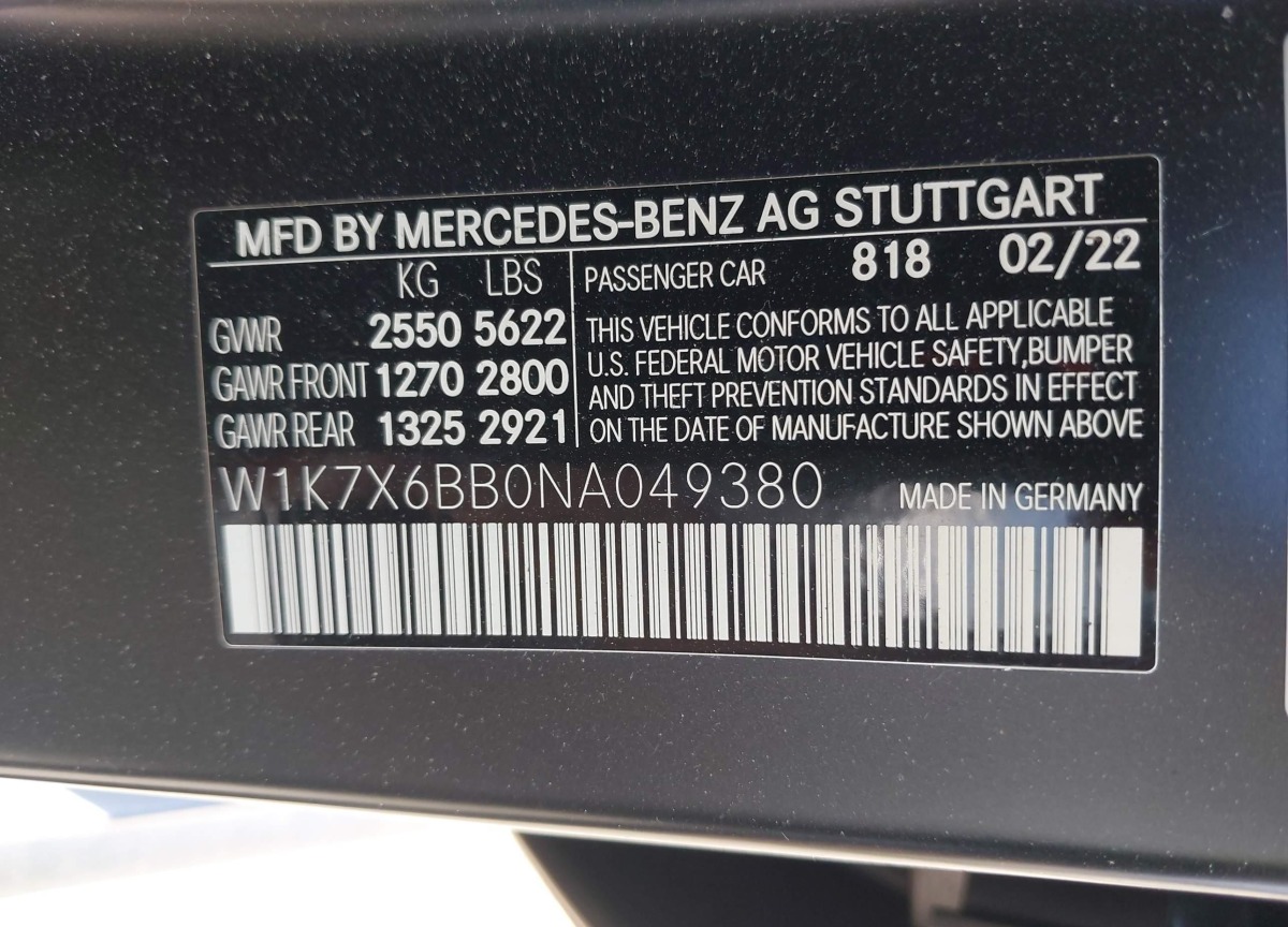 VIN:W1K7X6BB0NA049380