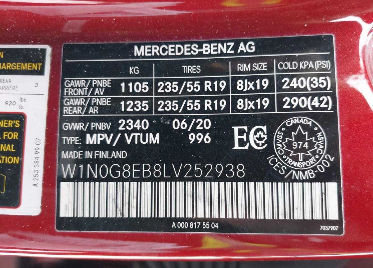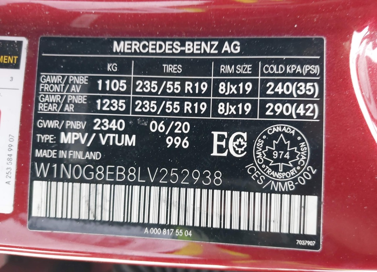 • VIN: W1N0G8EB8LV252938