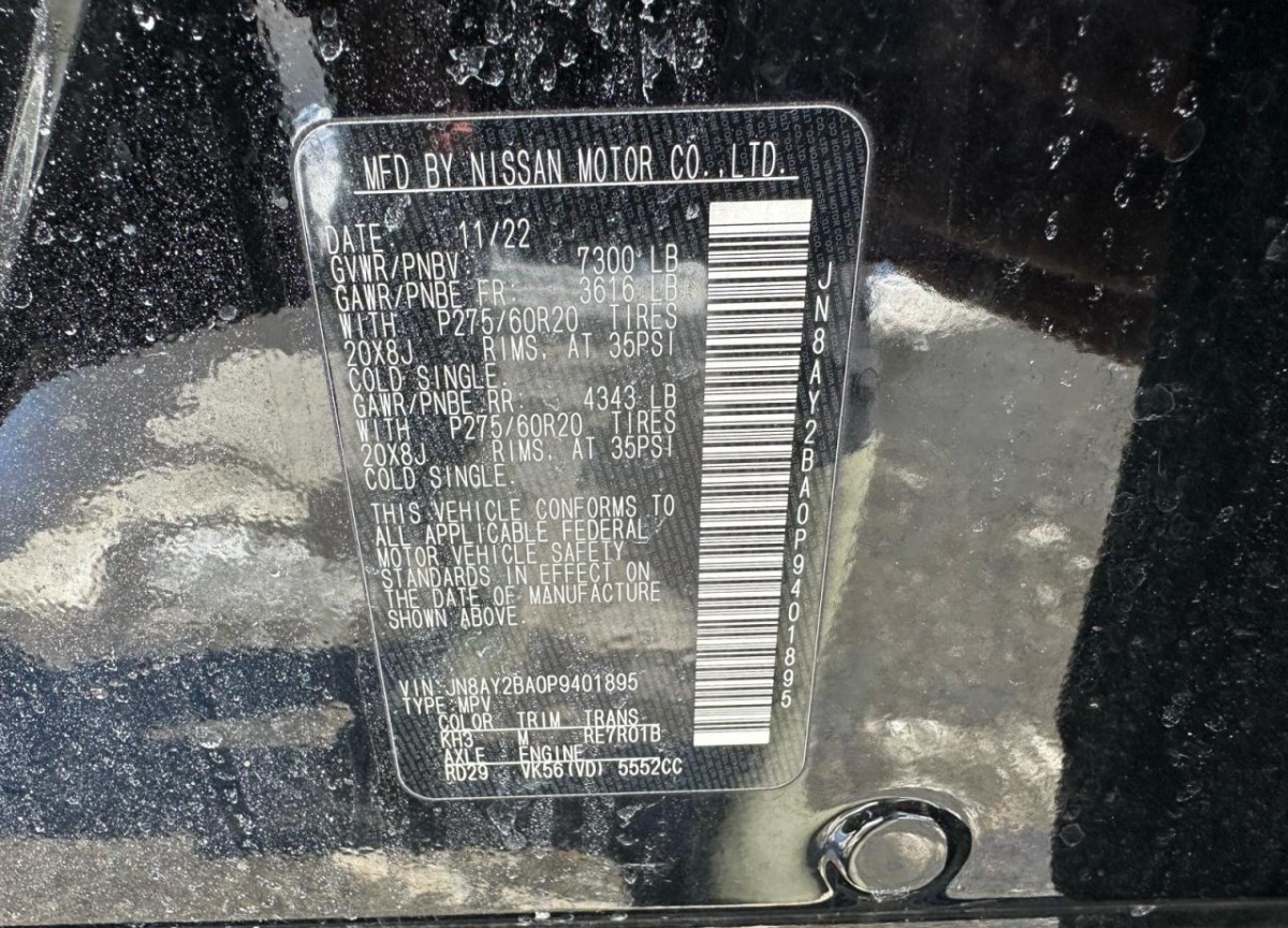 The Nissan Armada 2023 Black is equipped with a 5.6l 8 engine. This power unit is known for its efficiency and reliability, and it is part of modern generation of engines designed to balance performance with fuel economy. According to the auction data, the vehicle was registered with only 60906 of mileage at the time of sale.