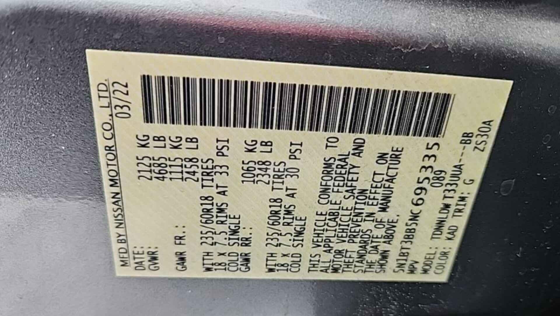 VIN:5N1BT3BB5NC695335