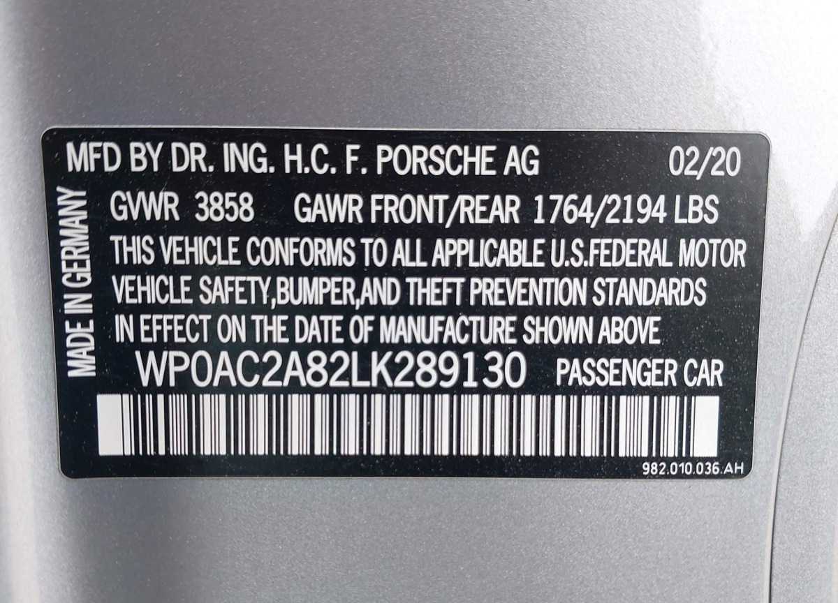 VIN:WP0AC2A82LK289130