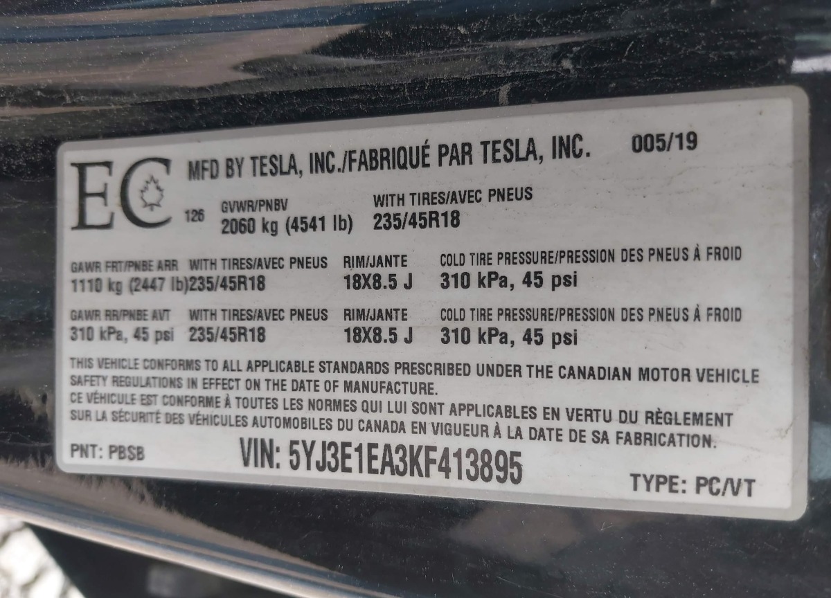 5YJ3E1EA3KF413895 Tesla Model 3 2019 Black – history, photos, price