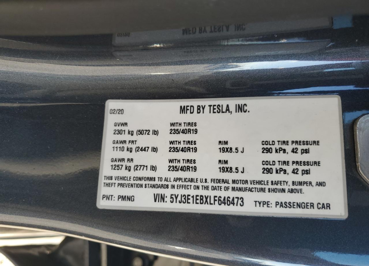 • VIN: 5YJ3E1EBXLF646473