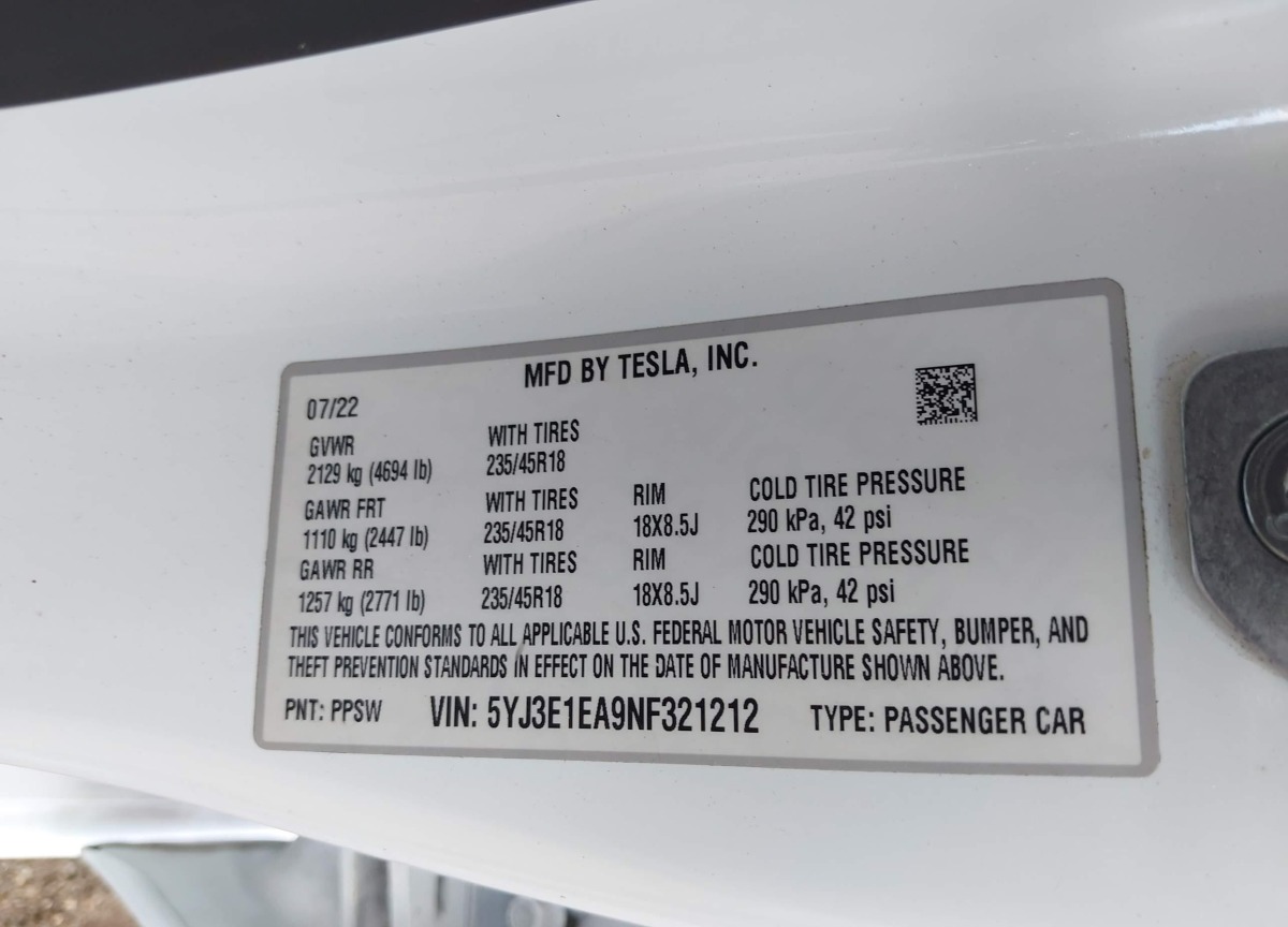 VIN:5YJ3E1EA9NF321212