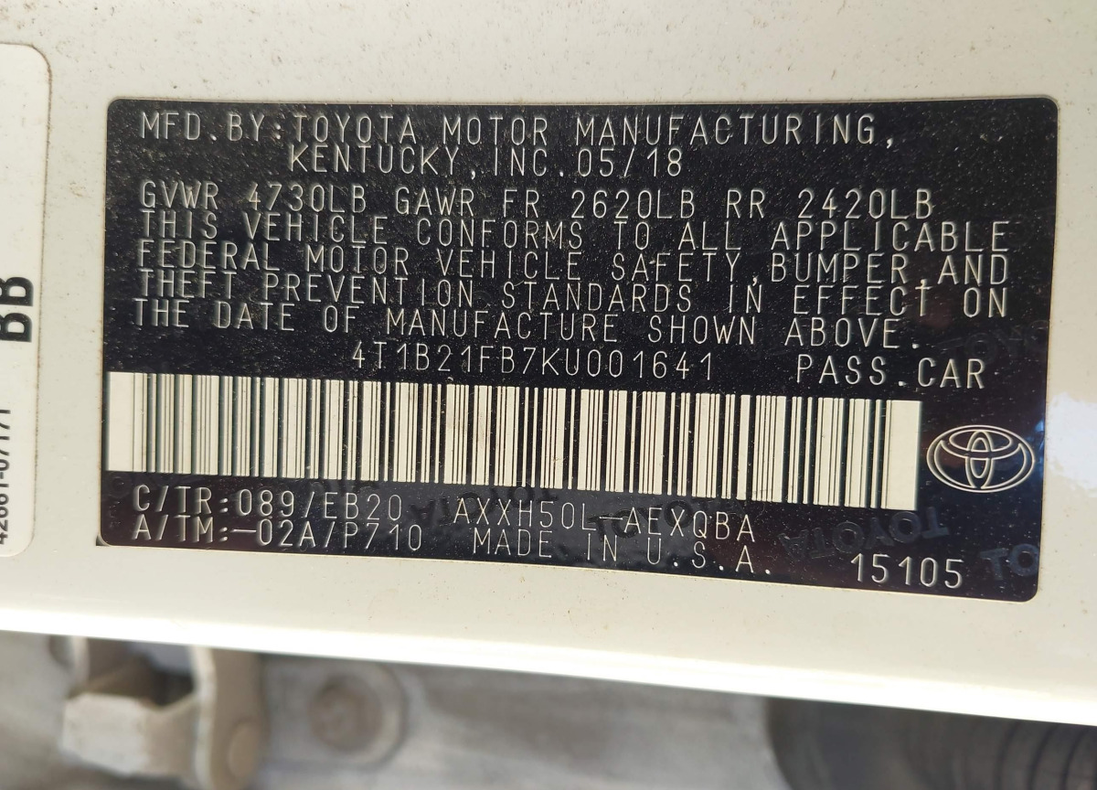 VIN:4T1B21FB7KU001641