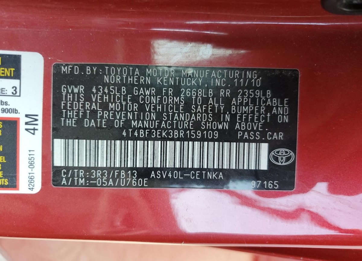 VIN:4T4BF3EK3BR159109