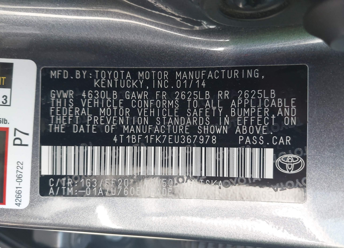 • VIN: 4T1BF1FK7EU367978