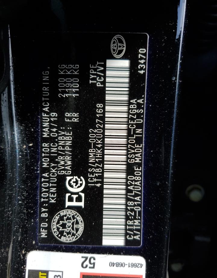 VIN:4T1BZ1HK4KU027168