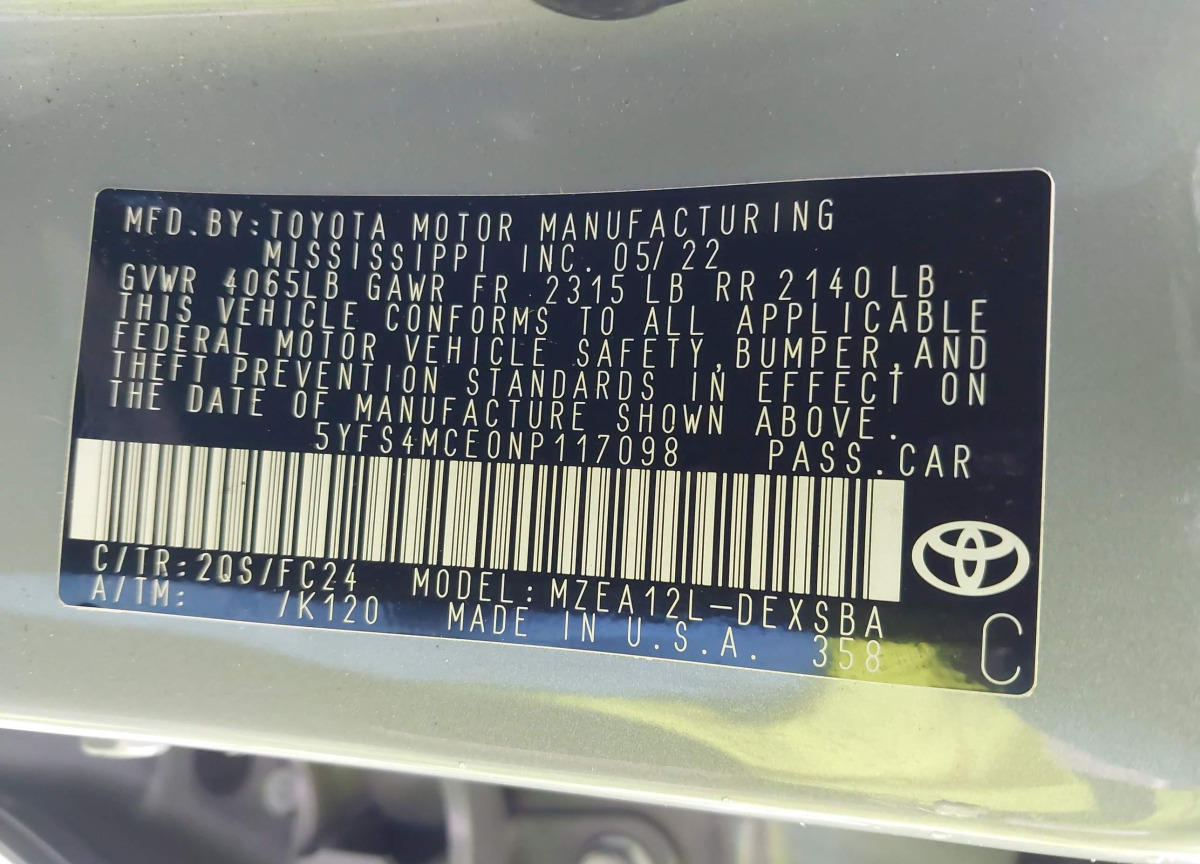 • VIN: 5YFS4MCE0NP117098