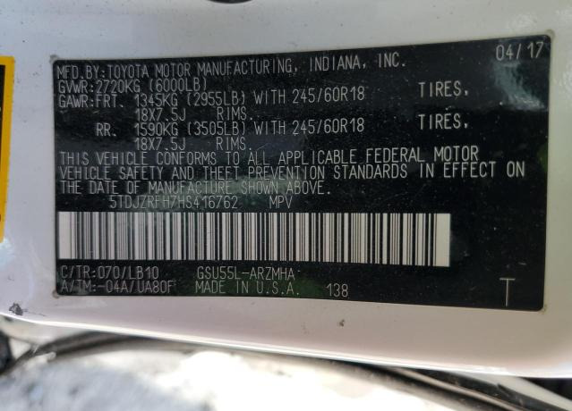 5TDJZRFH7HS416762 Toyota Highlander 2017 White – history, photos, price