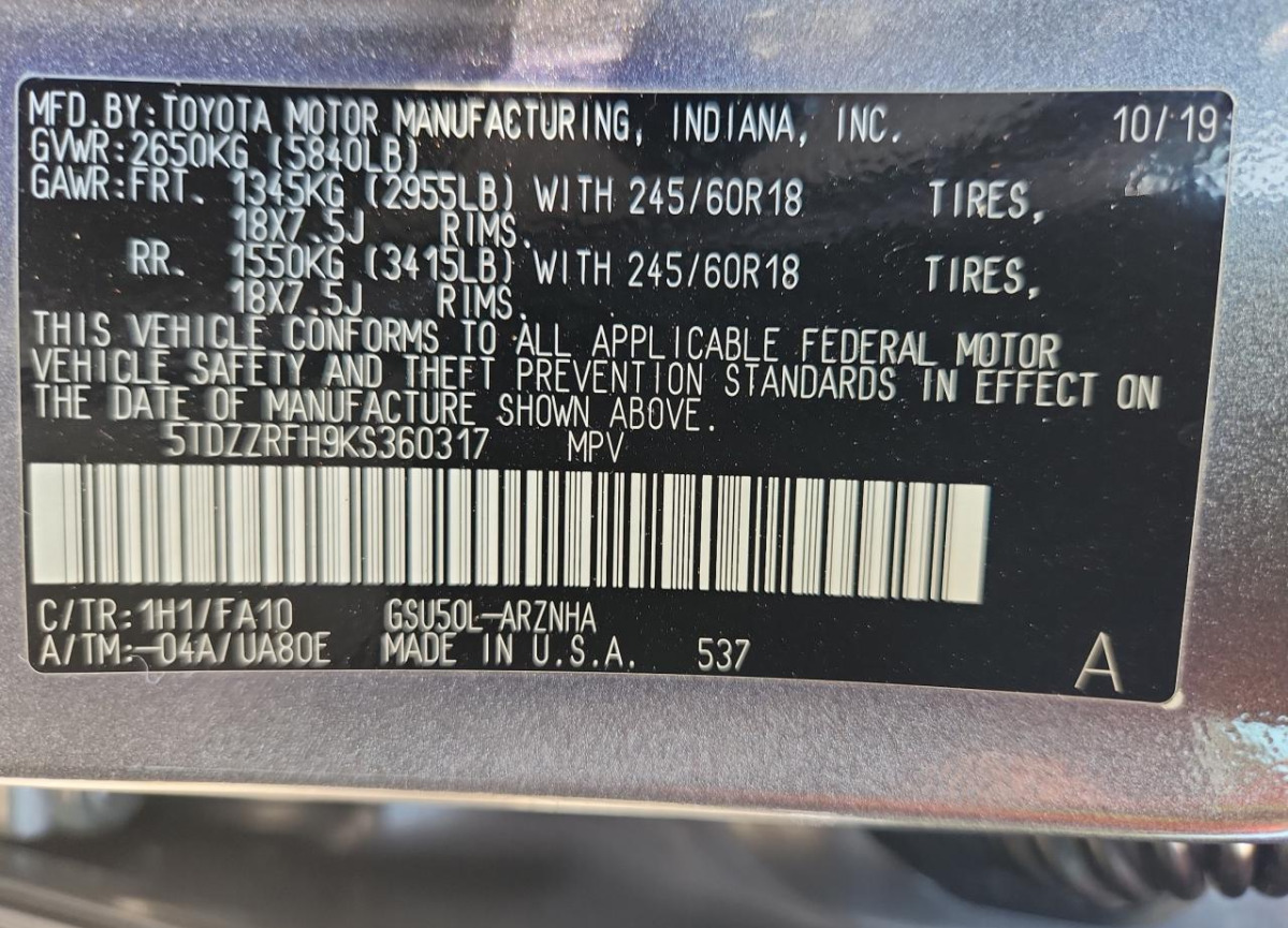 • VIN: 5TDZZRFH9KS360317