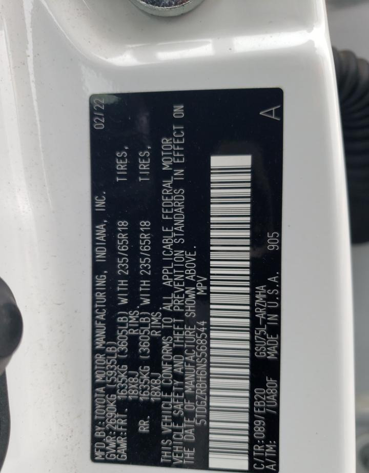 • VIN: 5TDGZRBH6NS568544