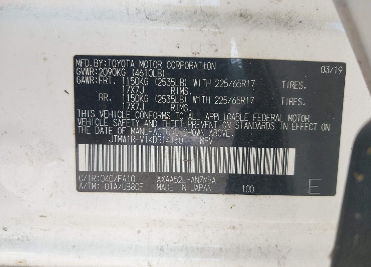 • VIN: JTMW1RFV1KD514160
