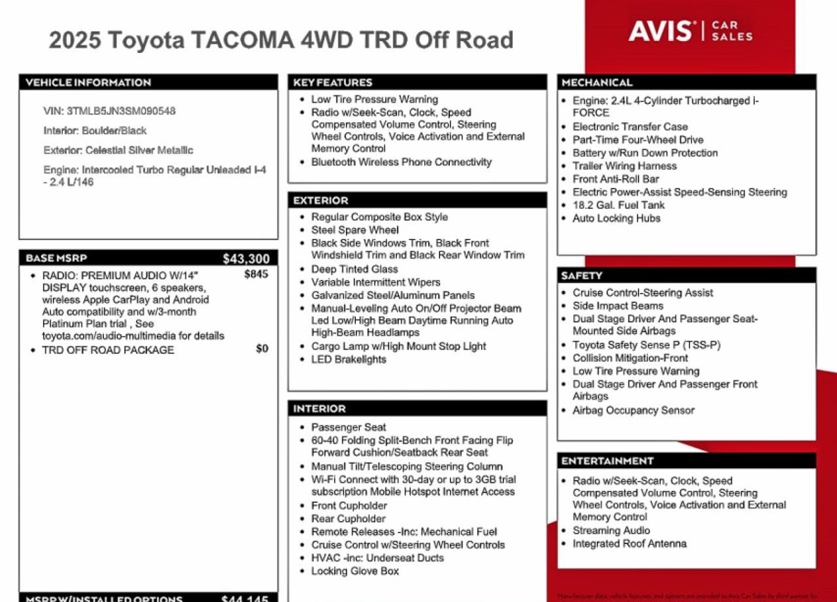 This Toyota Tacoma 2025 Silver was originally purchased at one of the major insurance auctions in the United States or Canada. The vehicle history is tied directly to its VIN code, which makes it possible to track the origin, condition, and circumstances of the sale. The photographs provided represent the actual state of the car at the moment of auction and serve as an important visual record of its technical and cosmetic condition.